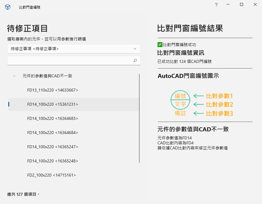 一次比對多個資訊,例如門窗編號、尺寸或防火時效,提供高效的檢核功能。