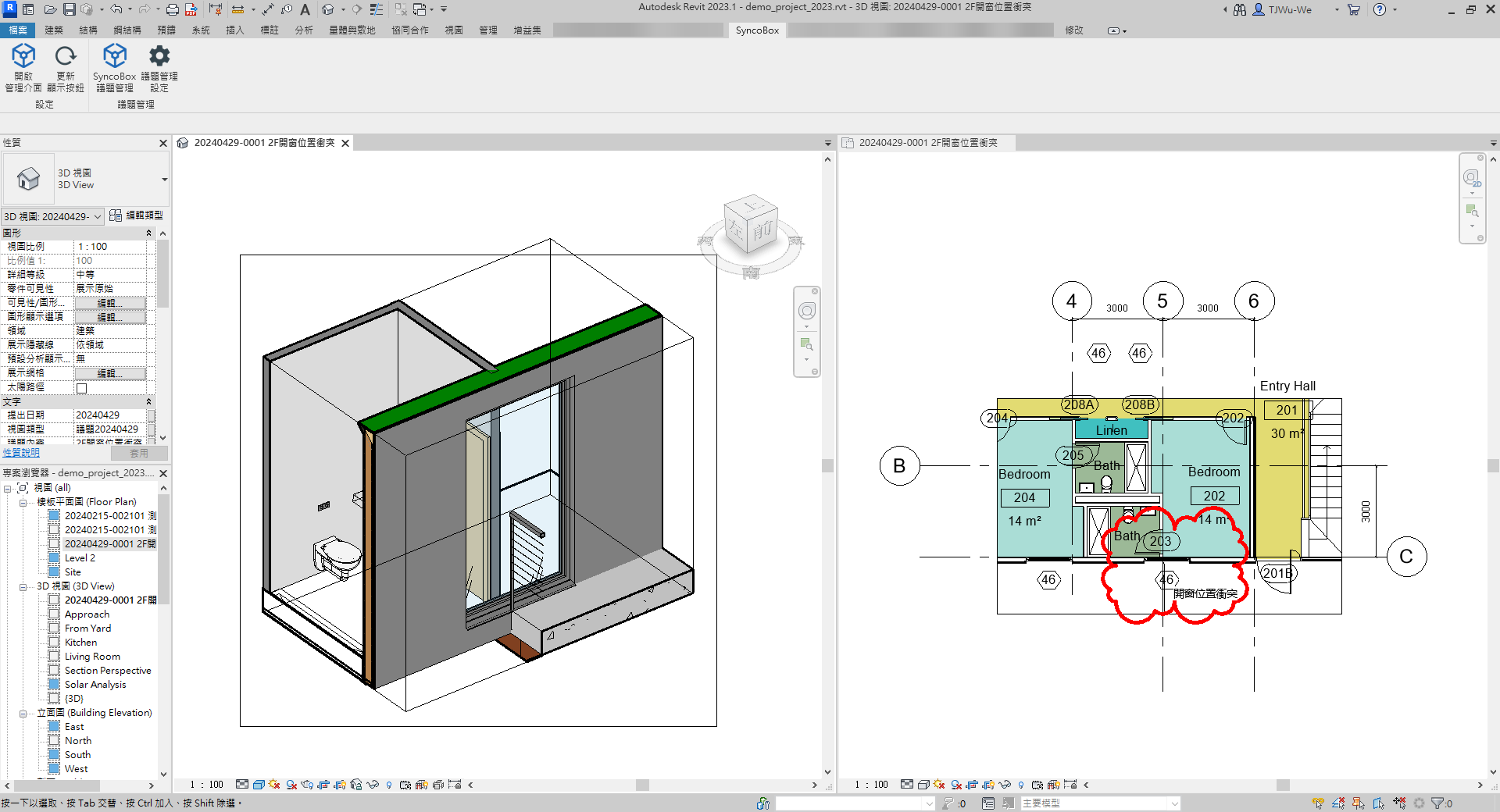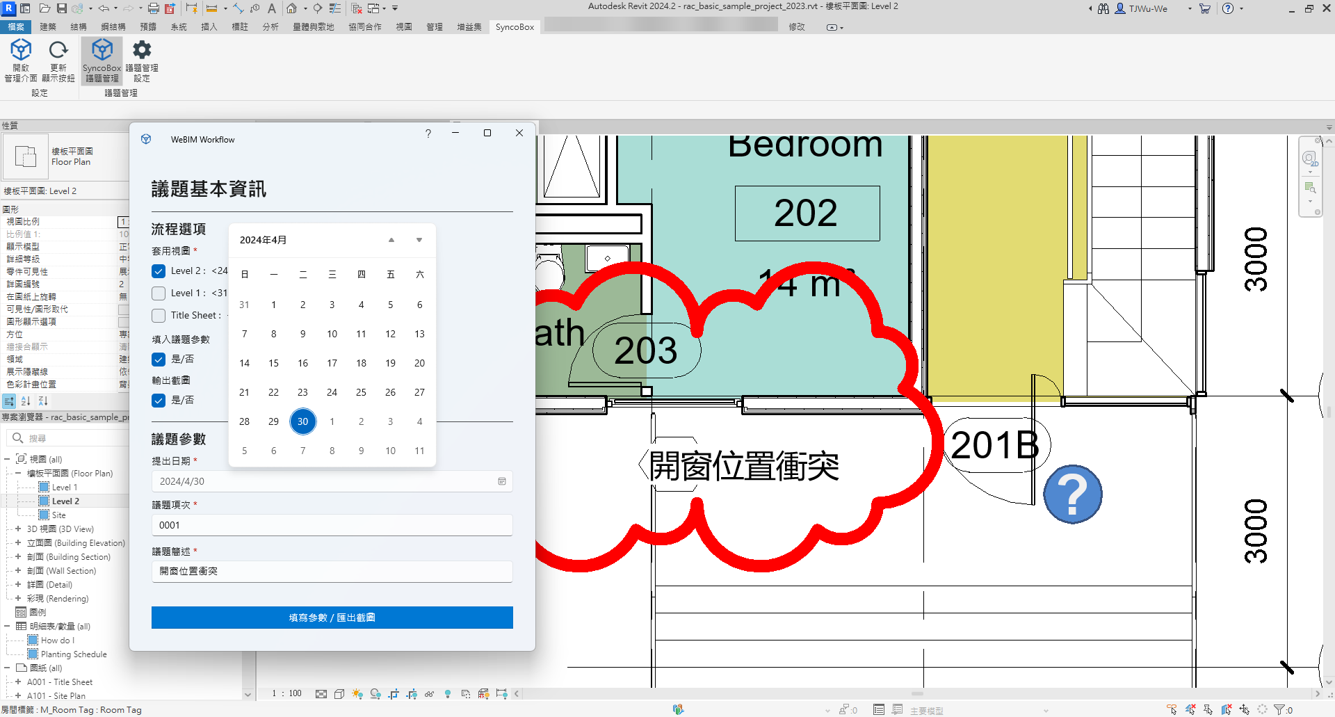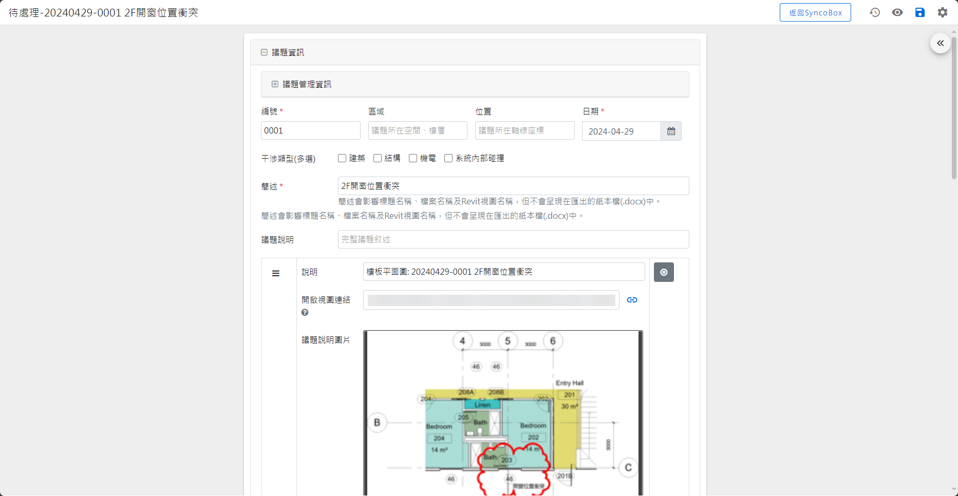 直接從Revit建立議題,並將模型資訊及截圖自動同步至SyncoBox,提高議題處理的效率與資訊正確性。